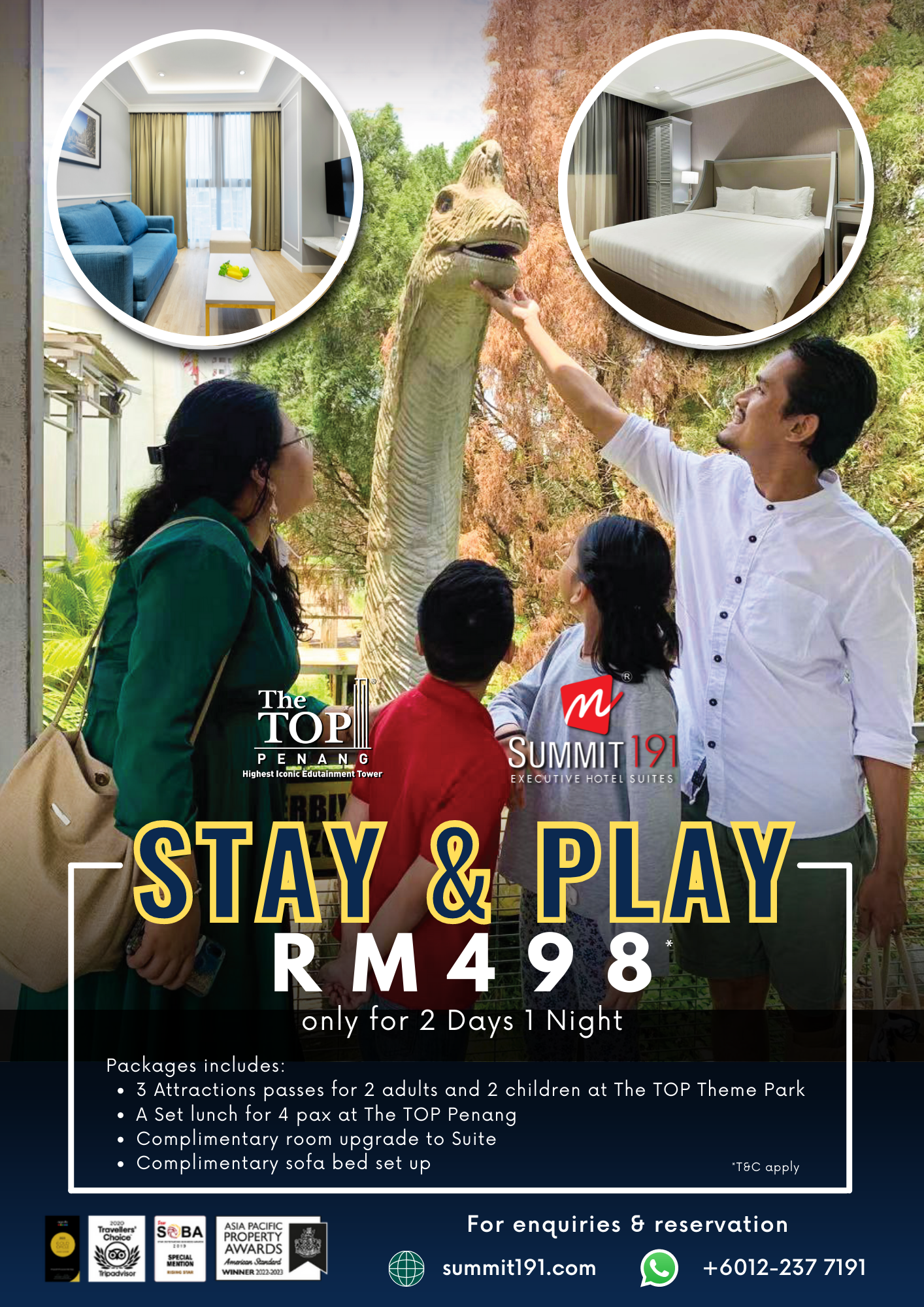 - The Stay & Play package includes a 2-Day-1-Night stay in M Summit 191 Executive Hotel Suites, complimentary lunch for 4 pax at Only Mee Restaurant with 3 attraction passes for 2 adults and 2 children at The Top theme park